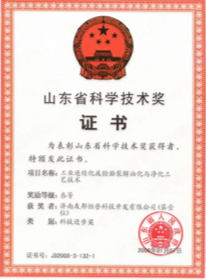 2009年1月7日,公司《工業(yè)連續(xù)化廢輪胎裂解油化與凈化工藝技術》被授予“山東省科學技術獎(科技進步獎)”